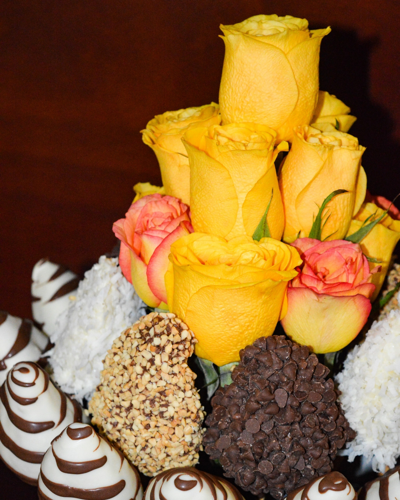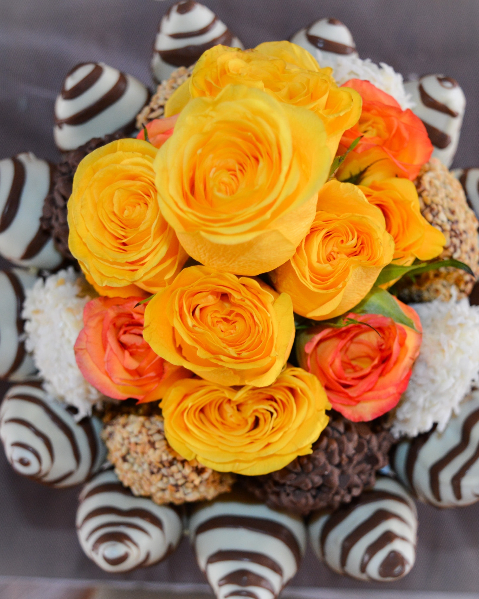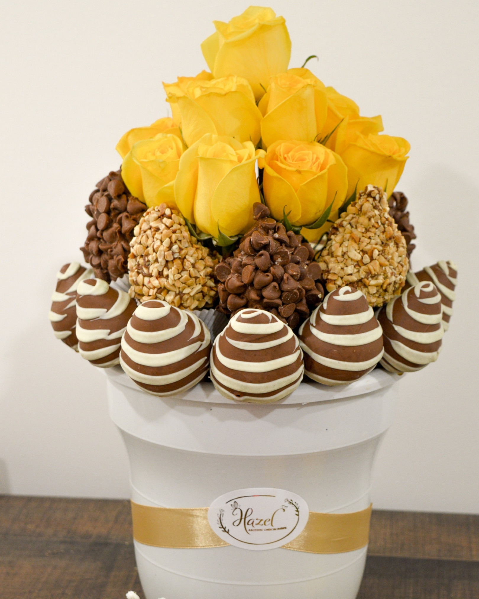 Bouquet with 12 Yellow roses, surrounded by around 20 chocolate covered strawberries.
