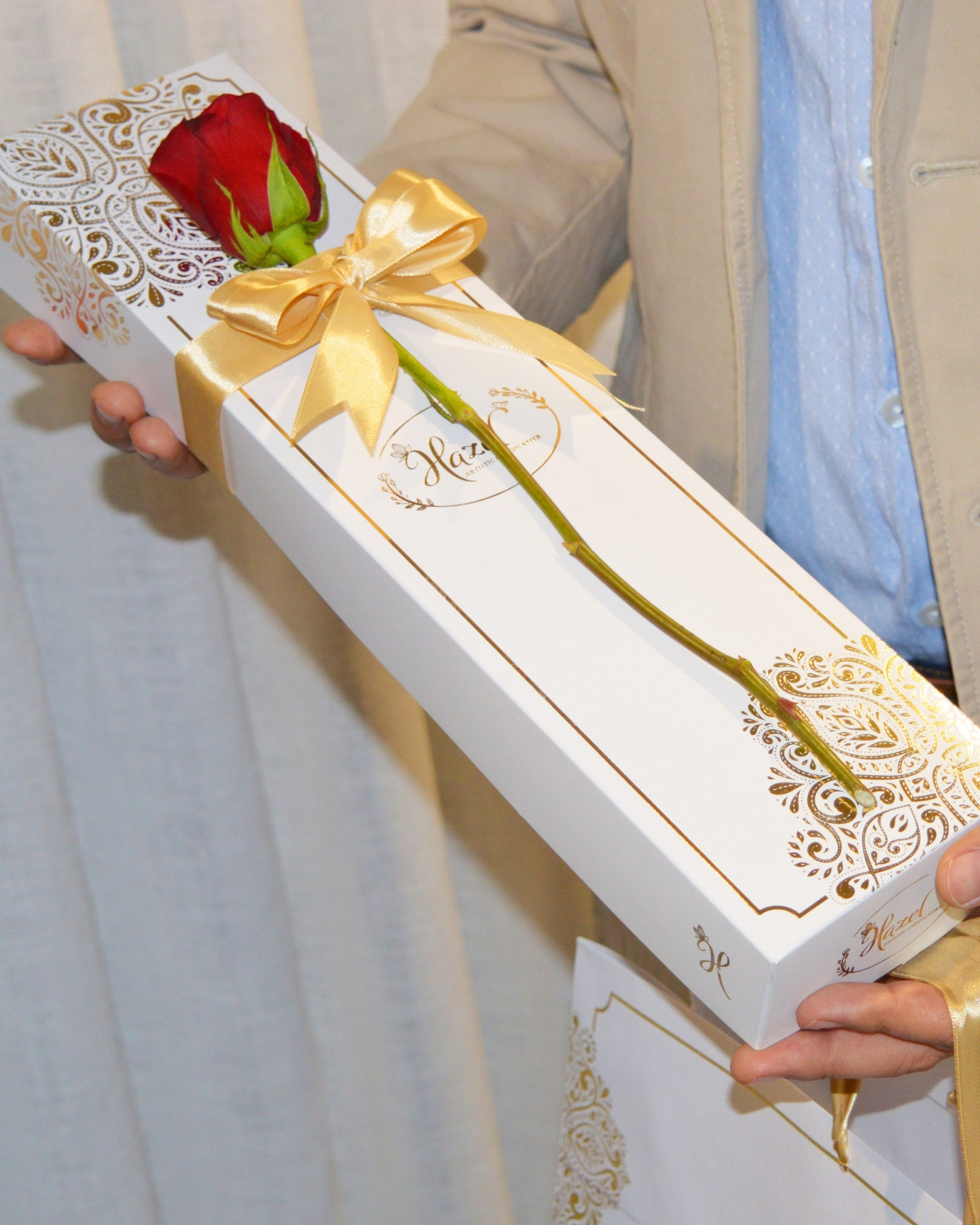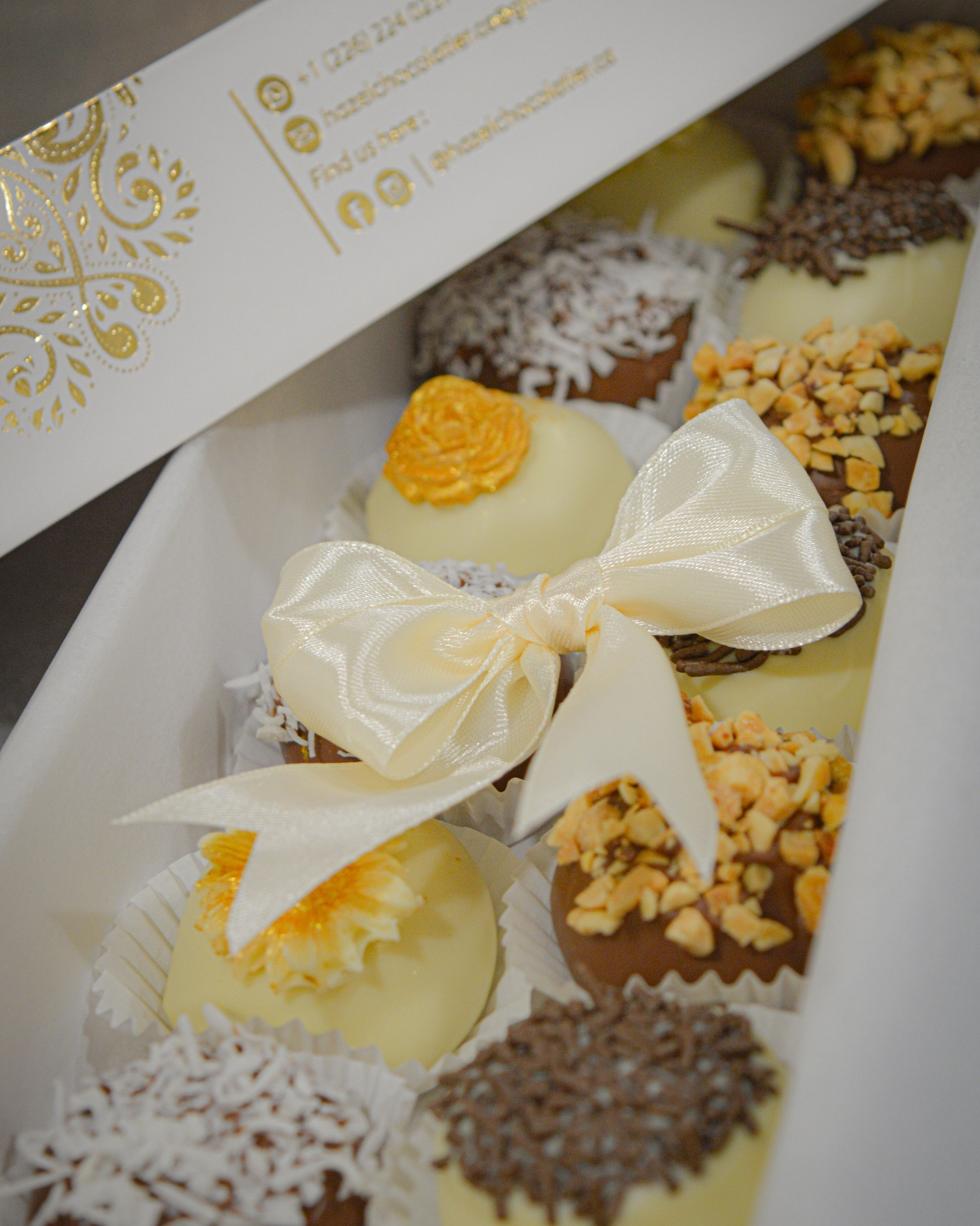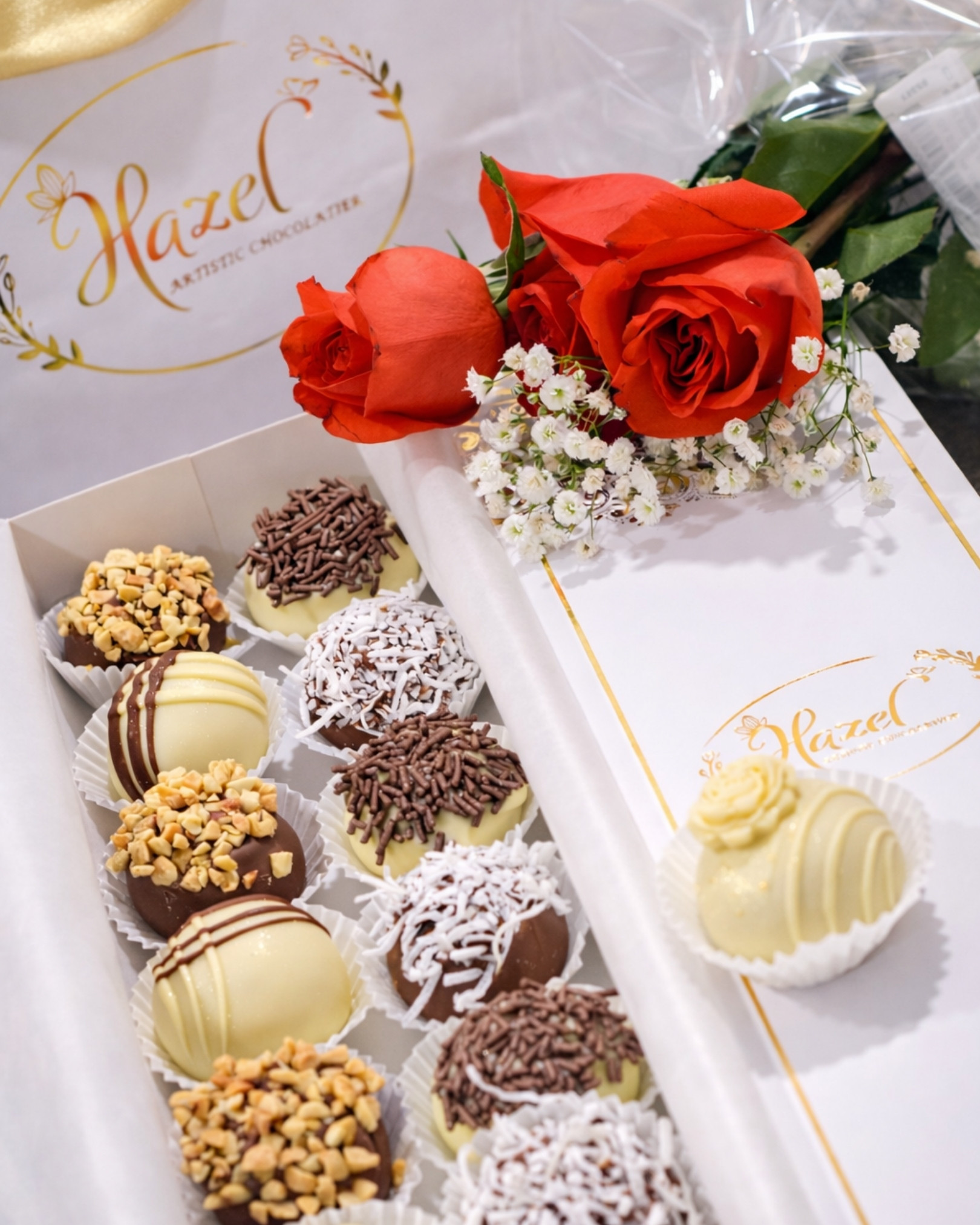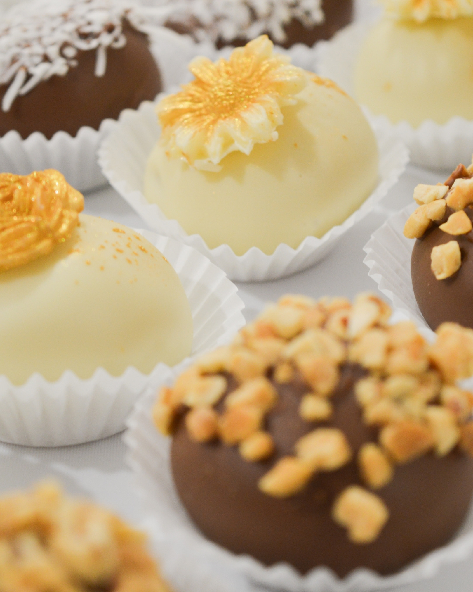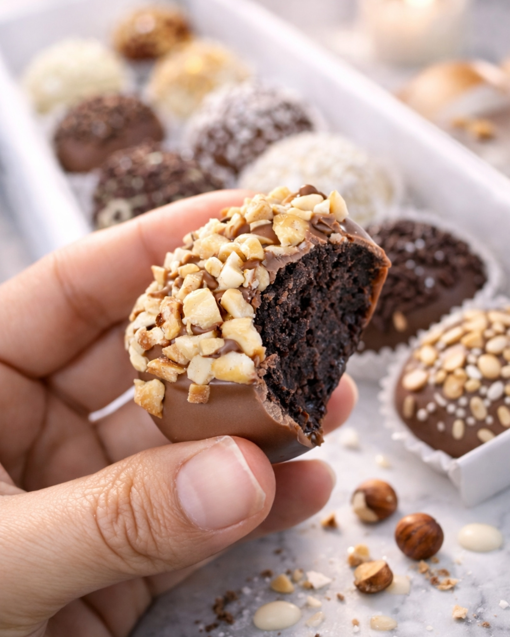 Box with 16 bites base in black and white choco-cake and toppings like peanuts, chocolate chips and coconut.