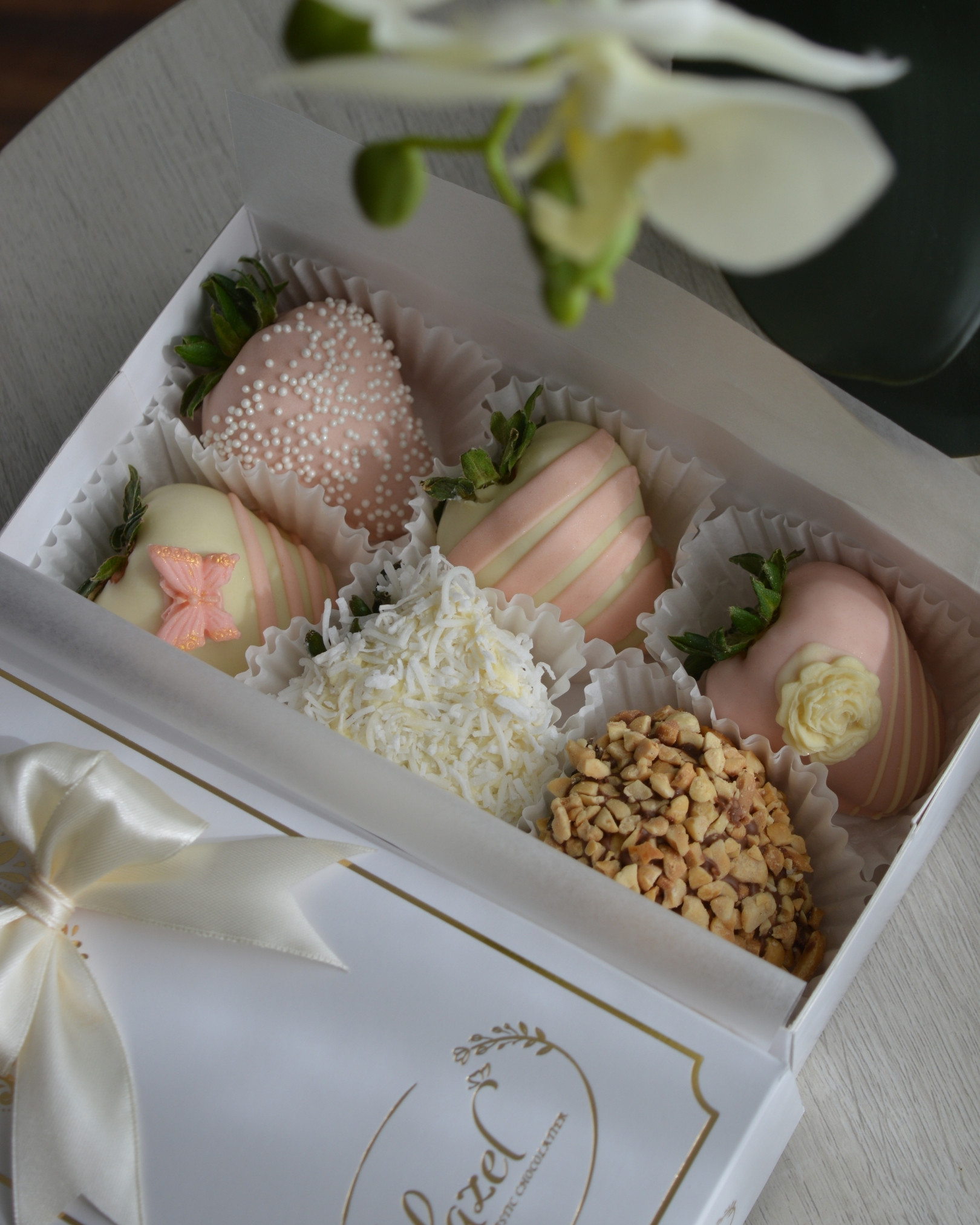 Box with 6 strawberries and toppings like peanuts, sprinkles and coconut.