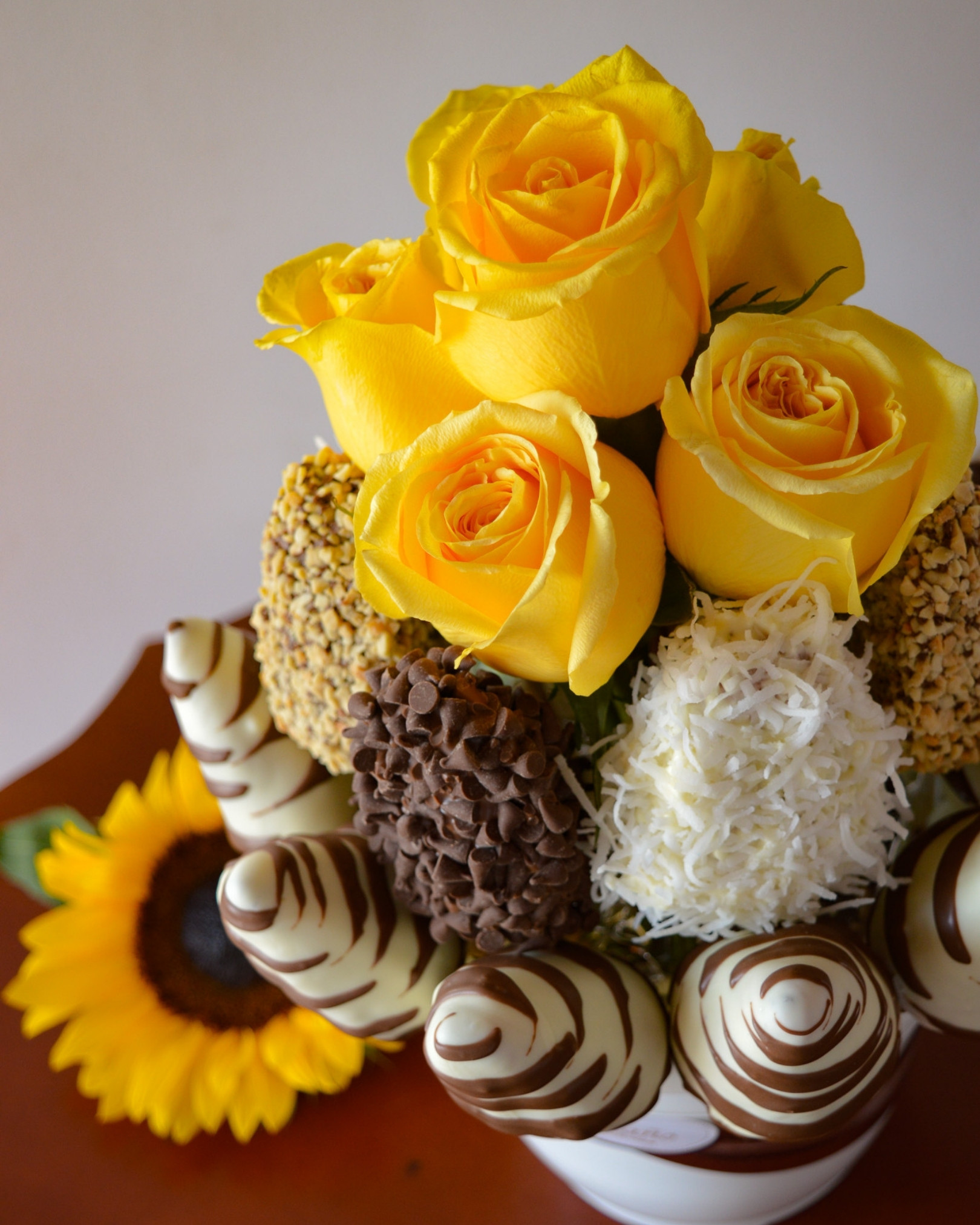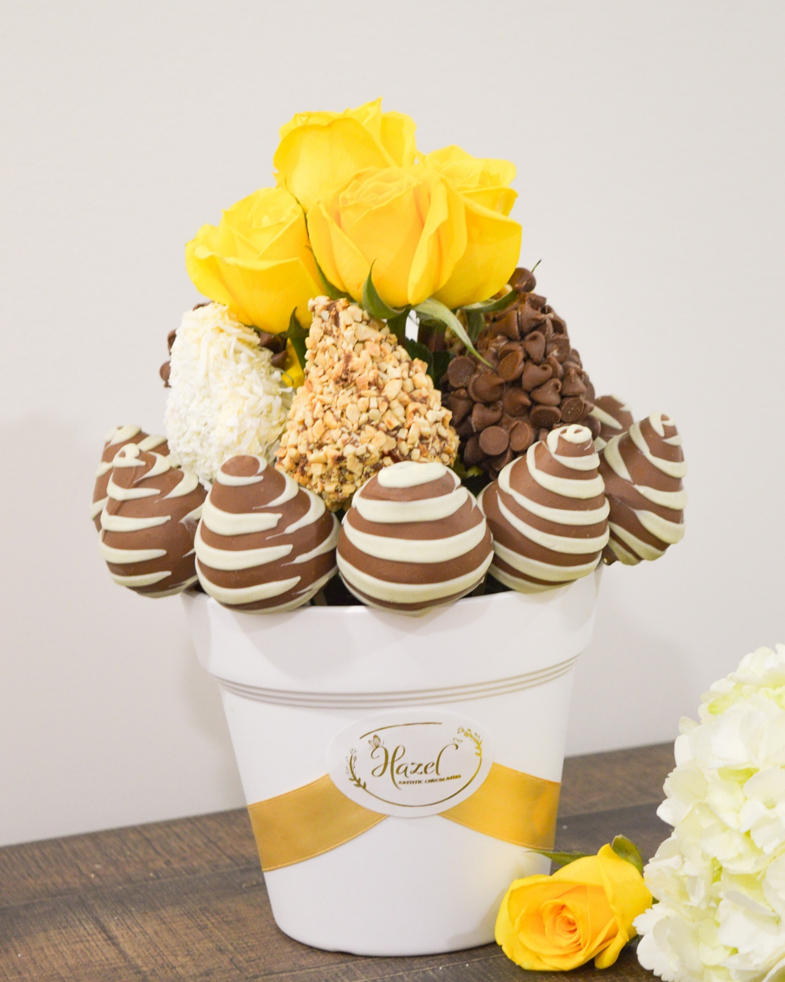 Unveiling our Petit Bouquet with 6 roses surrounded by around 16 chocolate covered strawberries and toppings like peanuts, chocolate chips, almond and coconut.