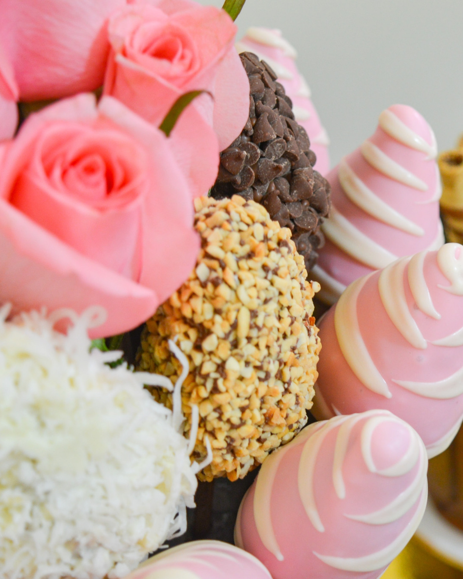Bouquet with 12 Pink roses, surrounded by around 20 chocolate covered strawberries.
