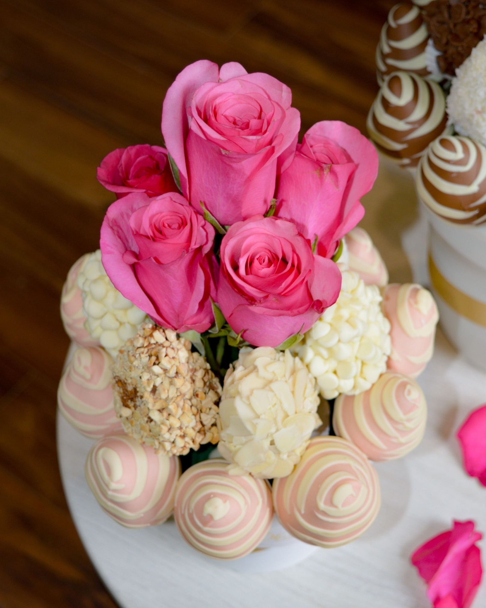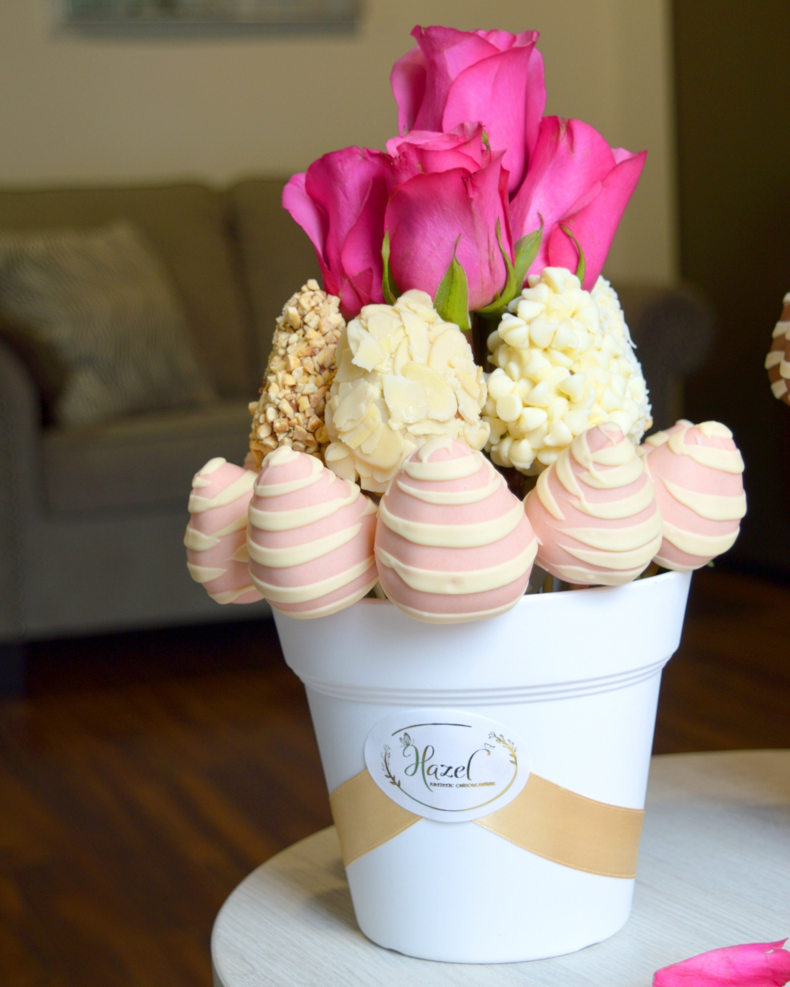 Unveiling our Petit Bouquet with 6 roses surrounded by around 16 chocolate covered strawberries and toppings like peanuts, chocolate chips, almond and coconut.