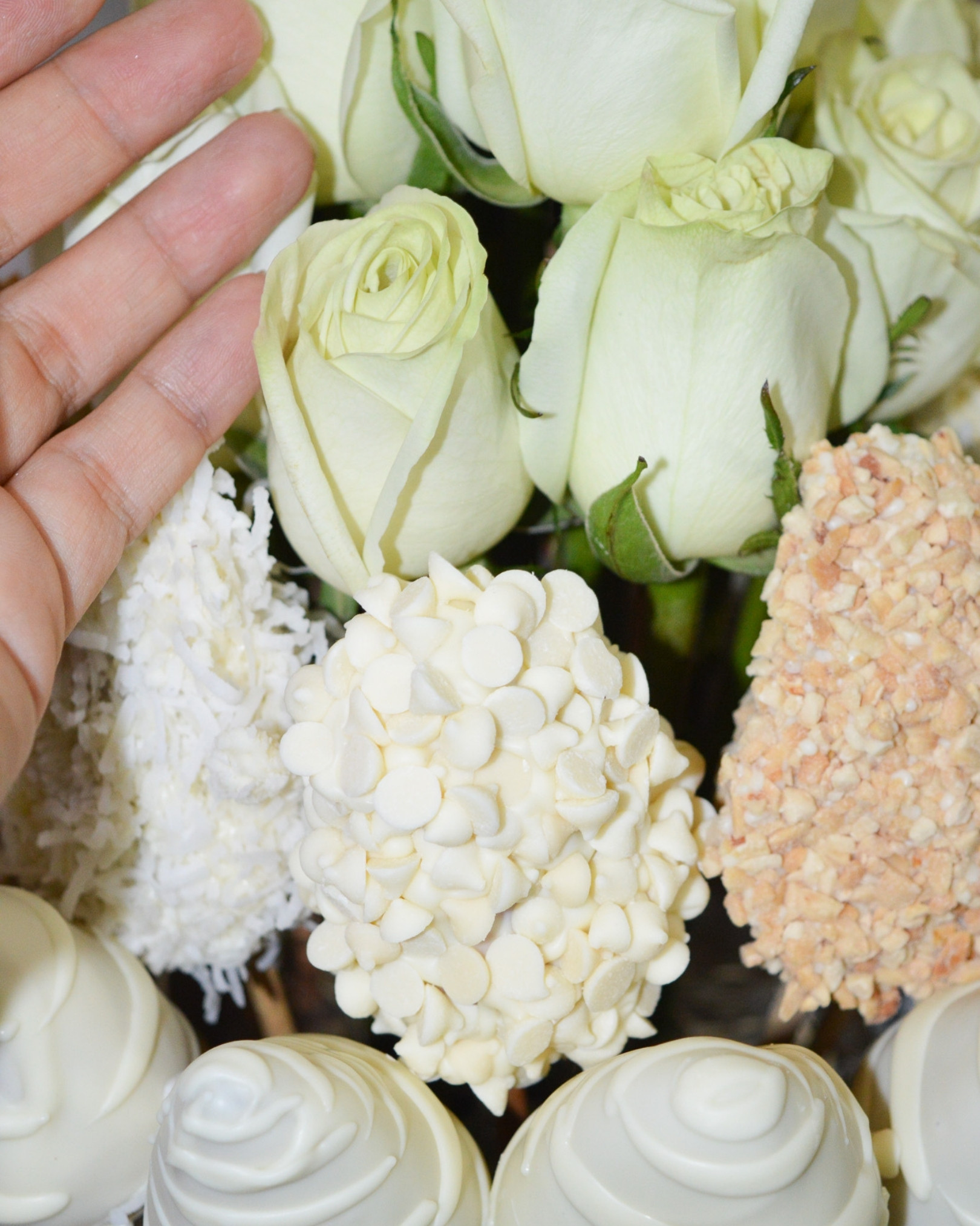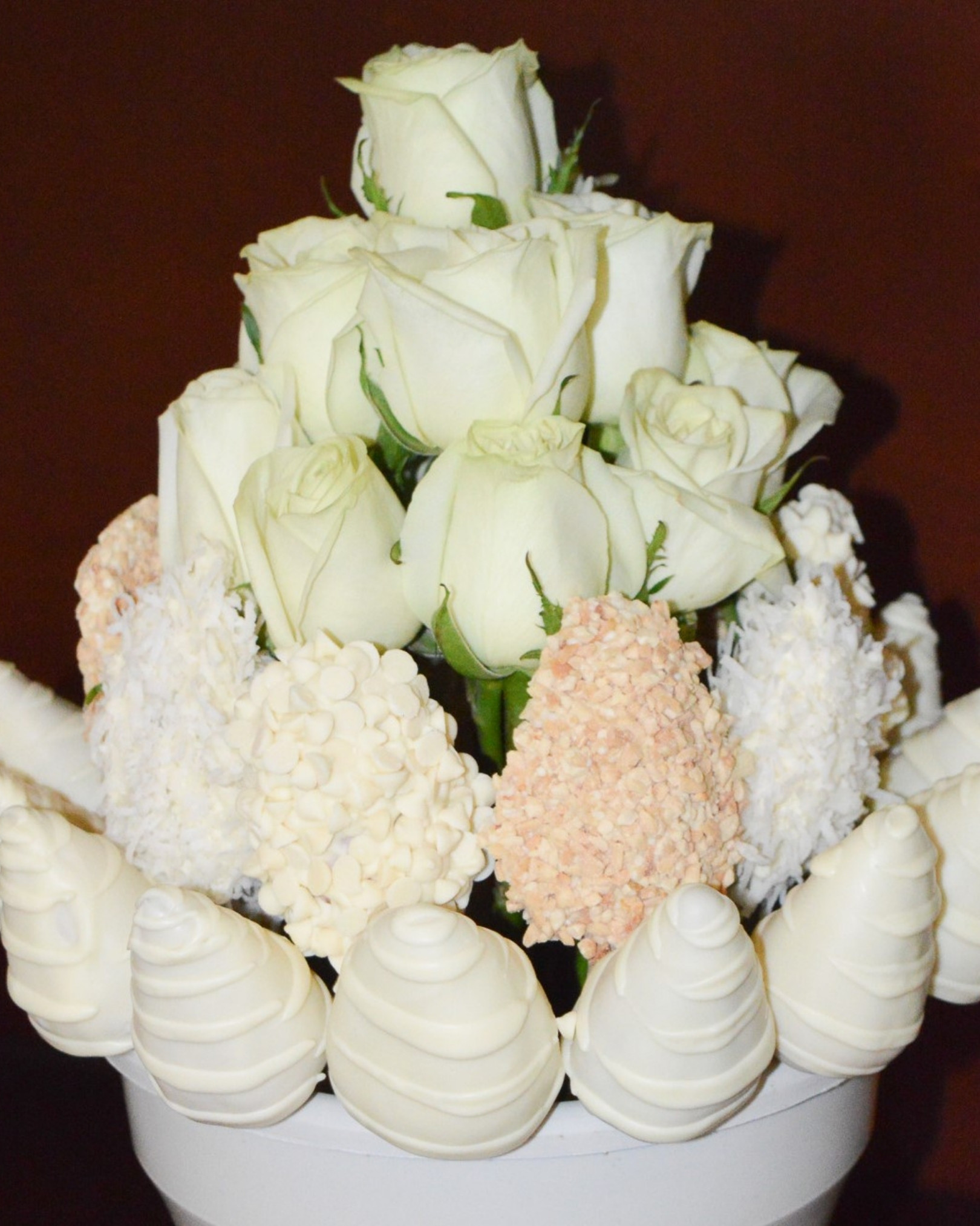 Bouquet with 12 Pink roses, surrounded by around 20 chocolate covered strawberries.